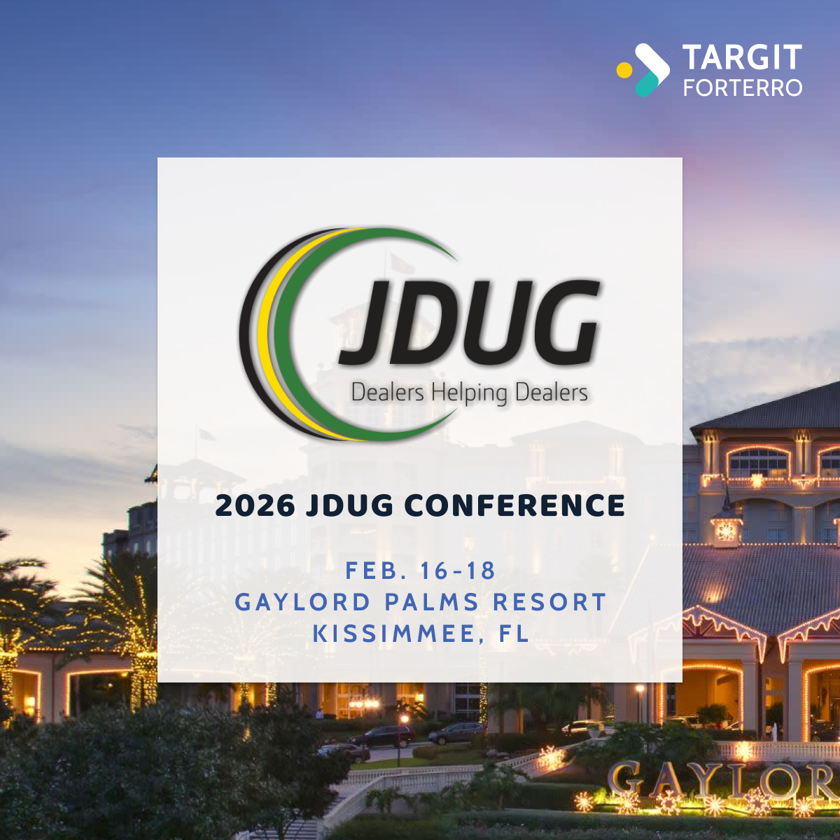 Catch up with TARGIT at the 36th annual John Deere Information System User Group (JDUG) Summit in Kissimmee, FL! Stop by Booth #822 to say hello to our heavy equipment experts, and connect with John Deere dealers, employees, and exhibitors over three days of networking and education sessions.